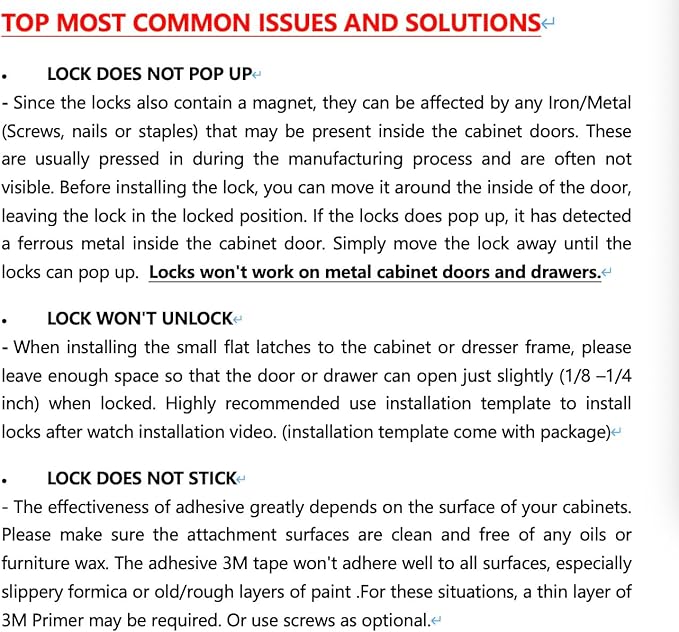 - [ INSTALLATION TIPS] The locks can be affected by any Iron/Metal (Screws, nails or staples) that may be present inside the cabinet doors, and not visible. Before installing the lock with the adhesive, move it around the inside of the door, leaving the lock in the locked position. If the locks does not pop up, it has detected a ferrous metal inside the cabinet door. Simply move the lock away until the locks can pop up, and install the lock in that position.
