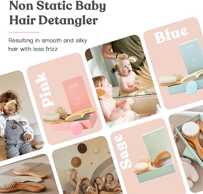 - WOODEN BRUSH AND COMB SET! This baby hair brush set for newborns includes four baby grooming accessories, a soft wooden goat hair brush for baby, a sturdy wooden detangler brush for longer hair, a wooden bristle comb for the toddler age, and a silicone scrubber brush for removing cradle cap. Our product grows with your little one from age 0 to 5!