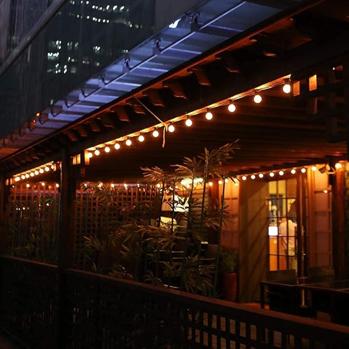 - ♝Outdoor string lights LED vintage bulbs glow natural warm light, perfect for Bistro, Backyard, Cafe, Gazebo, Weddings, Garden, Tents, Dinner Parties, Birthday Parties decor. G40 Patio String Lights create a romantic atmosphere that your can enjoying friendly time with you family and friends