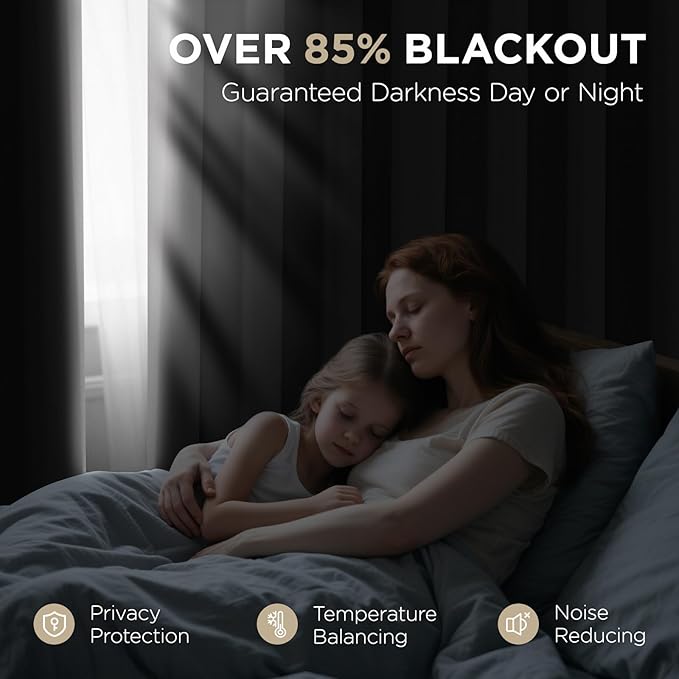 - Superior Blackout & Energy Savings: Black out curtains feature triple-weave technology for professional-grade light blocking. Dark colors curtains block 85%-99% of sunlight; light colors curtains block 65%-80%. Creates ideal darkness for sleep or naps. Thermal insulation helps regulate room temperature, reducing energy costs year-round.
