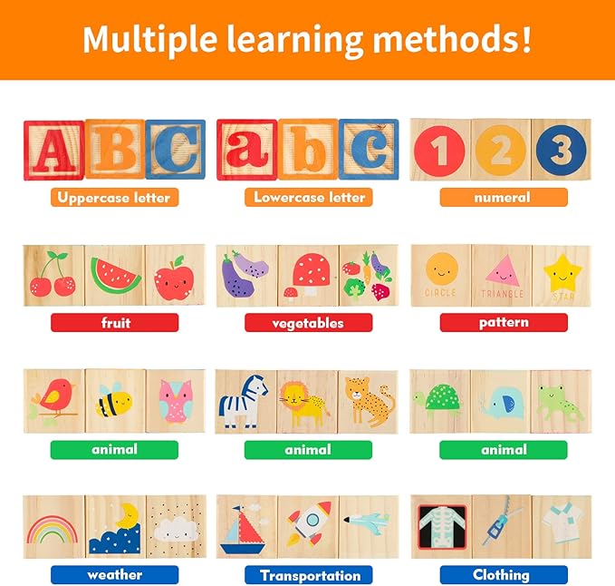 - ALPHABET&NUMBER BLOCKS SET: Our 30 piece wooden abc/number blocks for a total of 180 sides, each side is unique and carefully designed. One side of each block is uppercase and the opposite side is the lowercase, and the other sides contain colorful pattern of shapes, animal, fruits, vegetables. The abc blocks are great building blocks for toddlers and preschoolers for introducing letters of the alphabet, color recognition, reading and writing in a fun way in preparation for kindergarten