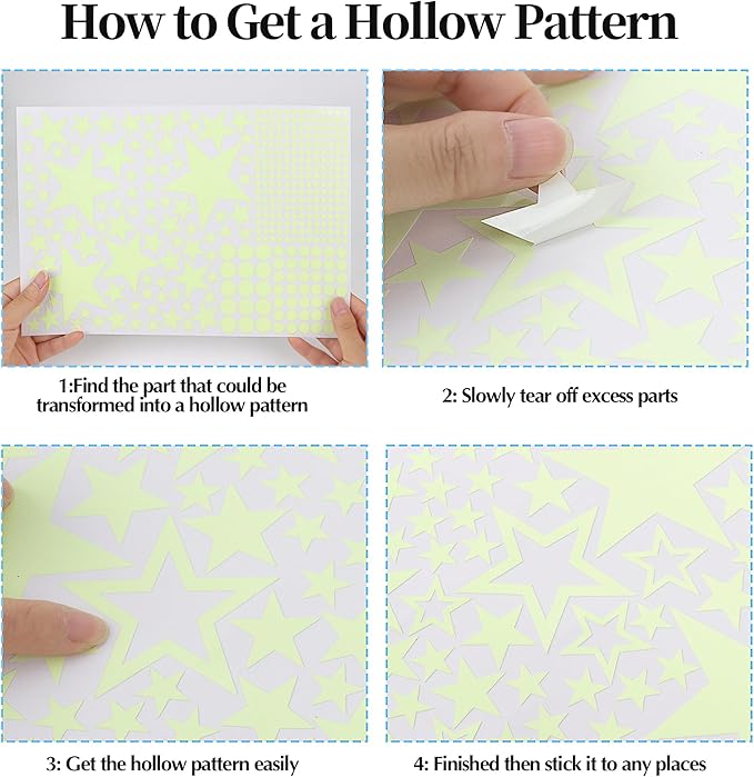 - Easy to Install and Tear Off:The glow in the dark stars are made of quality vinyl and luminous materials,nice and thick, waterproof.These stickers come with powerful backing adhesion,very easy to install,just peel-stick-install.The space wall decals can cling strongly to any surfaces for years.Also they are extremely easy to remove and reposition,and never hurt your wall and leave no residues when you don't want it