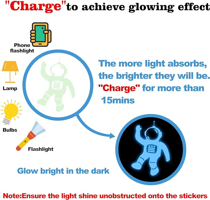 - Glow Brighter and Longer:Our moon and star decals are beautiful,very realistic and glow like crazy,they glow brighter and longer than the typical glow in the dark stickers,the brightness depends on the light it absorbs.you just need to put them under sunlight,room light or flashlight for 15 mins.Note:Please ensure the light shines unobstructed onto the moon.If you stick our stars for ceiling,please charge them with flashlight or room light before night