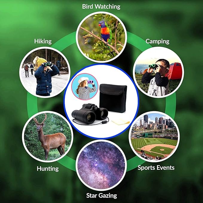 - Best Gift for Kids : Designed for kids binoculars,soft-rubber eyepiece protect the eys, so kids won't hurt their eyes.The compact kids binoculars can be folded to match eye to eye Distance Of Child.Great for bird watching, learning, hunting, theater, boat rides, hiking, traveling, and enjoying the wilderness! Explore the world with your kids!Perfect For The Children's Toy Or Educational Gifts