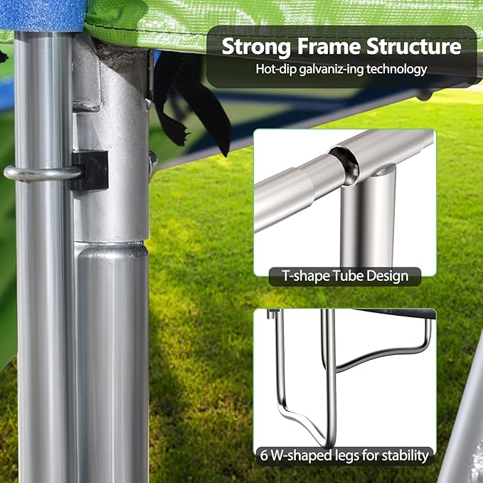 - 【Once For All Installation】This outdoor trampoline is made of galvanized frame inside and outside, legs are powder coated for extra protection against rust. No more need to disassemble the trampoline and bring it home even in the rain and snow day
