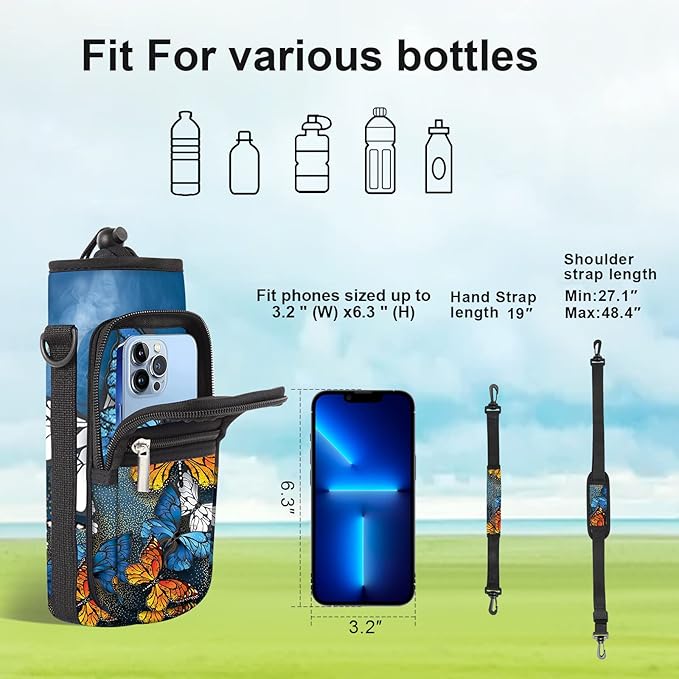 - 【Size】: Our AORTDES water bottle crossbody bag has 4 sizes to choose. 25oz (Max Bottle Diameter 8.2cm ≈ 3.23", Height 23cm ≈ 9.05", Pockets Size 7.48" x 3.93" x 1.57"). 32oz (Max Bottle Diameter 9.7cm ≈ 3.82", Height 20cm ≈ 7.87", Pockets Size 7.48" x 3.93" x 1.57"). 40oz (Max Bottle Diameter 9.7cm ≈ 3.82", Height 23cm ≈ 9.05", Pockets Size 7.48" x 3.93" x 1.57"). 64oz (Max Bottle Diameter 13cm ≈ 5.12", Height 23cm ≈ 9.05", Pockets Size 7.48" x 3.93" x 1.57").