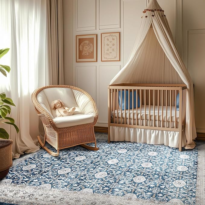 jinchan Floral Area Rugs 4x6 Machine Washable Vintage Distressed Boho Design Throw Rug Stain Resistant Carpet Low Pile Ultra-Thin Non-Slip for Bedroom Living Room Dining Room Kitchen(4‘x6',Drak Blue)