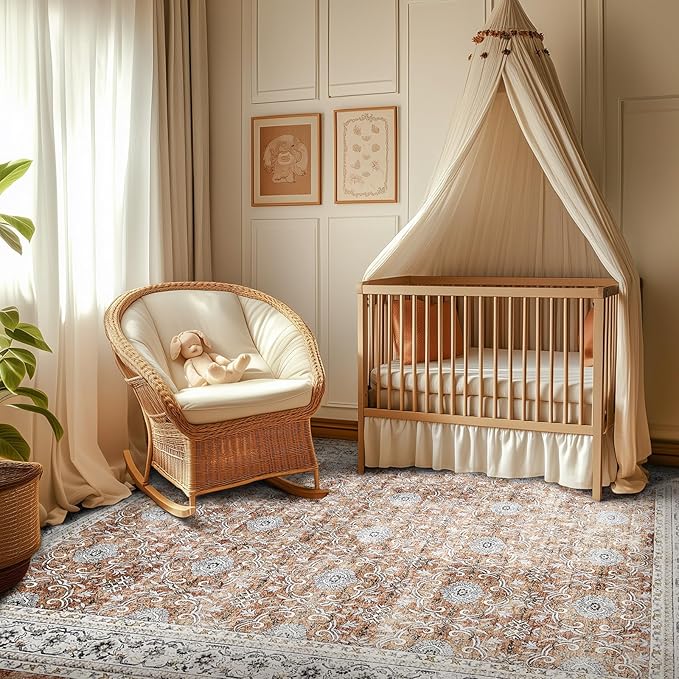 jinchan Floral 5x7 Area Rugs for Bedroom - Machine Washable Vintage Distressed Boho Design Throw Rug Stain Resistant Carpet Low-Pile Thin Non-Slip for Nursery Living Room Dining Room (5‘x7',Orange)
