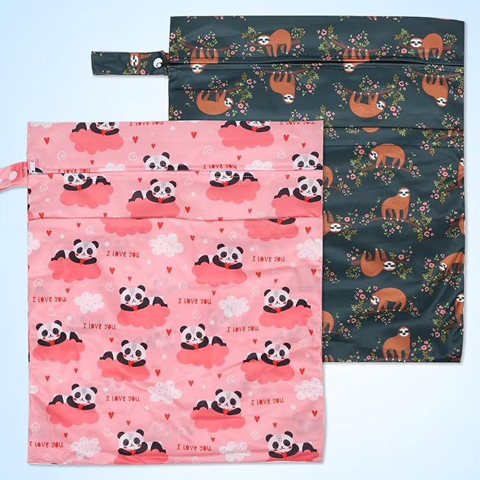 - 2 ZIPPERED POCKETS & HANDLE DESIGN: The 2 pack laundry bags are designed with 2 zippered compartments to keep wet and dry clothes separately, or separate dirty and clean diapers. Keep dry and clean. There's a handle with a button on one side for hanging up, convenient to carry and attach to your stroller, doorknob, towel rack, hook or handbag.