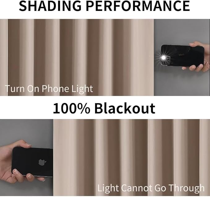 - 【Total Blackout】Joydeco curtains are a high-quality curtain with 100% blackout property. It adopts advanced blackout materials and production techniques, which can completely block external light penetration, providing excellent light control and privacy protection for you. Whether it is the intense sunlight during the day or the busy street lights, Joydeco curtains can effectively shield them, creating a dark, comfortable, and relaxing space.