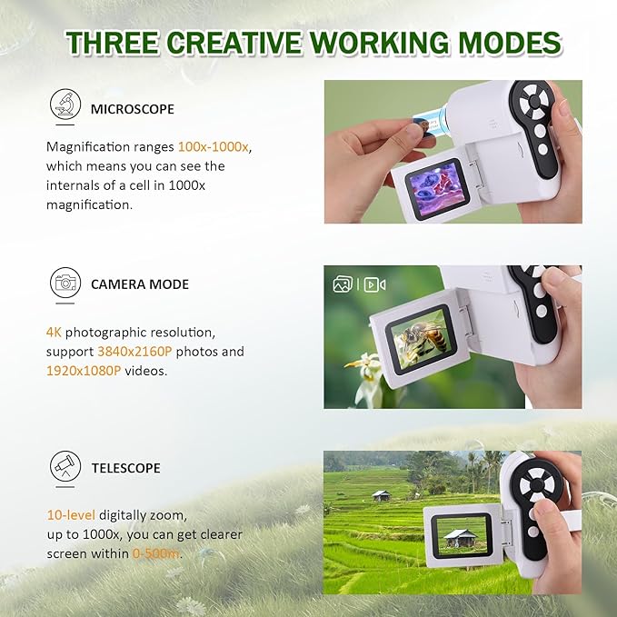 - ๐ฏ-๐๐ป-๐ญ ๐๐ฒ๐๐ถ๐ด๐ป: 1) Microscope Searching, 2) One-Click Photo & Video Recording, 3) Telescope, choose what you want to enhance child's learning experience. And this digital microscope made of 4K resolution, provides much higher clarity