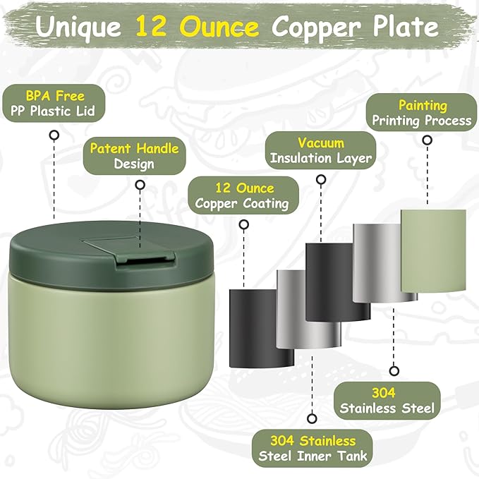 - Upgrade to 12 OZ Capacity: Bigger capacity can hold more food for children. The stainless steel soup thermal bottle is a double wall, with a vacuum in the middle, has good insulation performance, with a wide mouth design that is easier to clean.