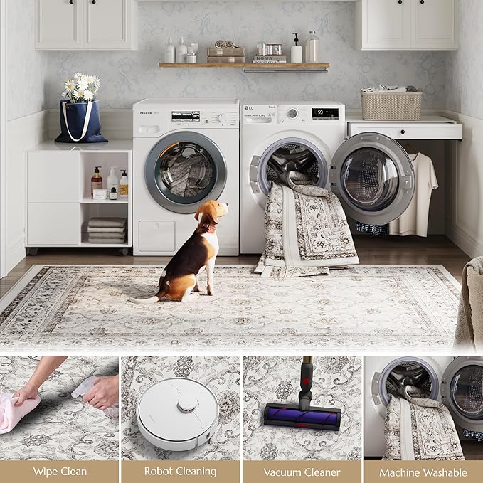 jinchan Hallway Runner Rug 3x10 - Machine Washable Beige Vintage Floral Distressed Design Soft Non-Slip Low-Pile Ultra-Thin Runner Rug for Kitchen Laundry Room Bedroom Farmhouse (3‘x10',Beige)