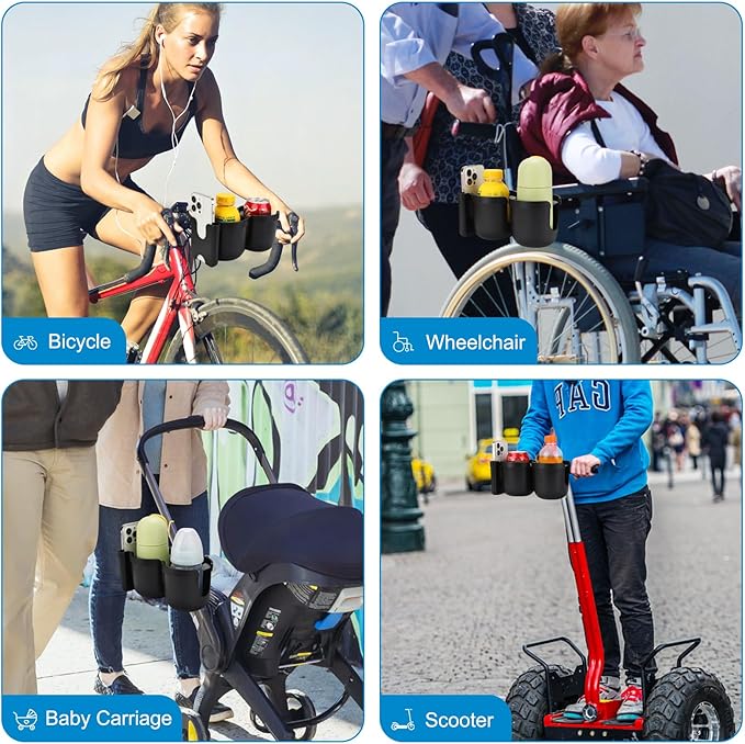 - Wide Compatibility: This universal cup holder with phone holder compatible with most baby strollers, walker, wheelchair, rollator, bike, scooter, boat handle bar, shopping cart, kayak, ATV, lawnmowers, motorcycle, treadmill, golf push cart and so on.
