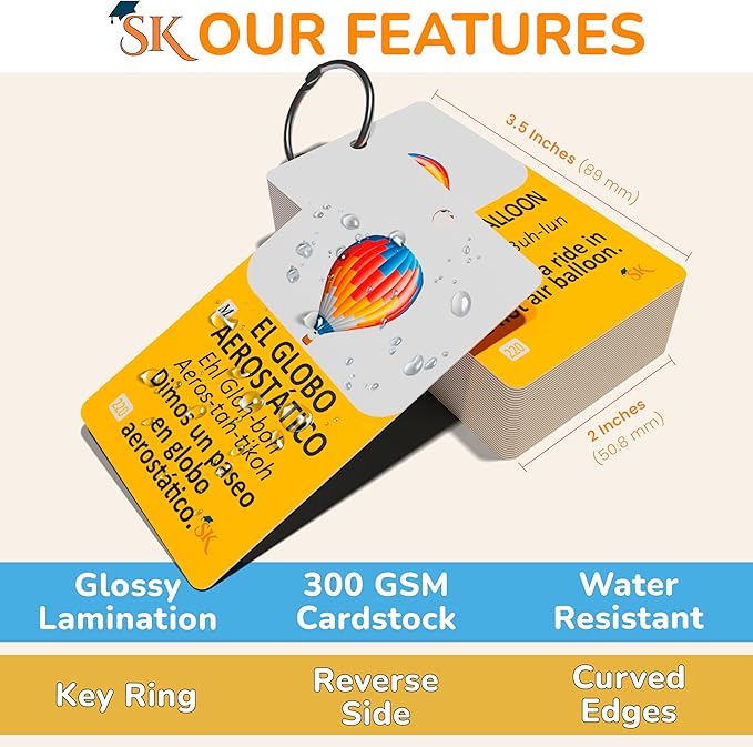 - Durable and Water-Resistant: Made from sturdy, laminated materials, these English-Spanish cards hold up to repeated use at home or on the go. A great tool to help kids & adults learn English through regular study, solo practice, or outdoor learning.