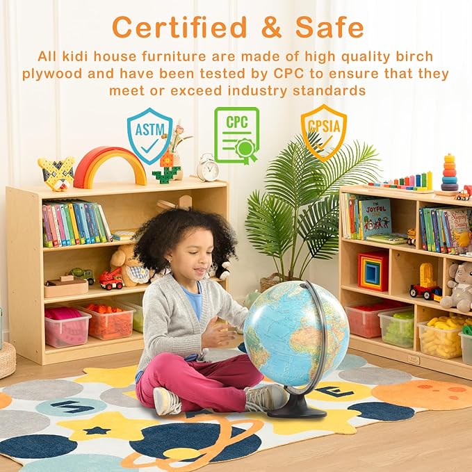 - Safe for Children: The Kidi House kids bookcase carries CPC certification and complies with ASTM + CPSIA standards. It features rounded corners and an anti-tip device that prioritizes child safety, making it ideal for creating a safe environment in any space. This low bookshelf for kids is perfect for nursery, playroom, bedroom, classroom, kindergarten, living room, reading room, daycare