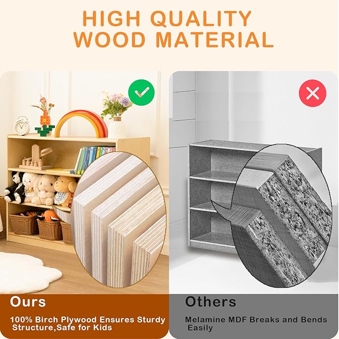 - Premium Birch Wood Quality: Our Montessori shelf is made from 100% birch plywood, ensuring a solid structure. The combination of natural wood texture and multi-compartment space makes it the perfect school or kids room storage solution to keep toys organized. The smooth surface is easy to maintain and wipe with a dry cloth