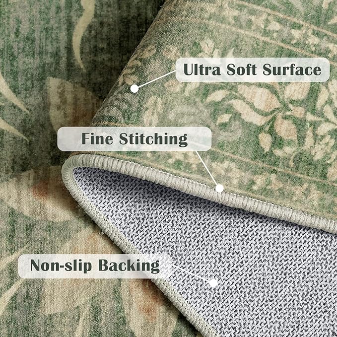 jinchan Vintage Floral Runner Rug 2x5 - Machine Washable Distressed Design Non-Slip Low-Pile Soft Thin Carpet for Hallway Kitchen Farmhouse Bedroom Entryway Laundry Room (2x5ft,Dark Green)