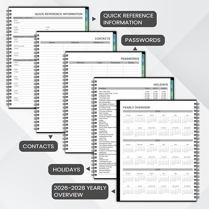 - π UNIQUE DETAILS - Calendar Planner Pages | 2 Contacts Pages | 2 Password Pages | Notes Section | 2026-2028 Yearly Overview | 2026-2028 Holidays | Notes Pages | Important Dates | Reference Calendars | Monthly Tabs | Double-sided Pockets | Premium Thick Paper | Flexible Cover | Bucket List
