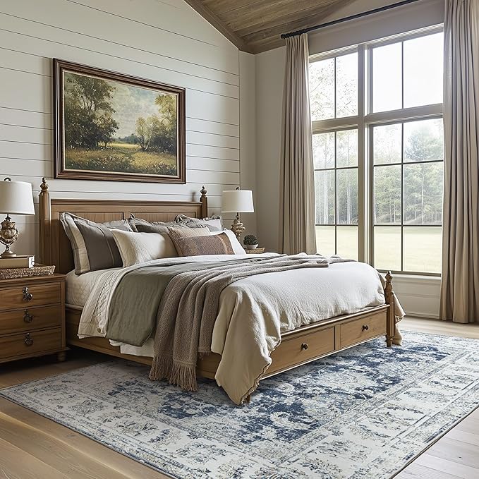 jinchan Washable Area Rug 8x10 for Living Room Soft Faux Wool Ultra-Thin Stain Resistant Non-Slip Distressed Vintage Floral Large Carpet for Bedroom,Dining Room,Home Office,Nursery(Dark Blue, 8'x10')