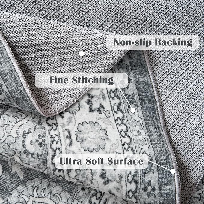 jinchan Round Rug 5ft Washable Circle Soft Rug - Low Pile Vintage 5'Round Indoor Grey Floral Print Stain Resistant Boho Carpet Ultra-Thin Non-Slip for Entryway Nursery Bedroom Dining Room Kitchen