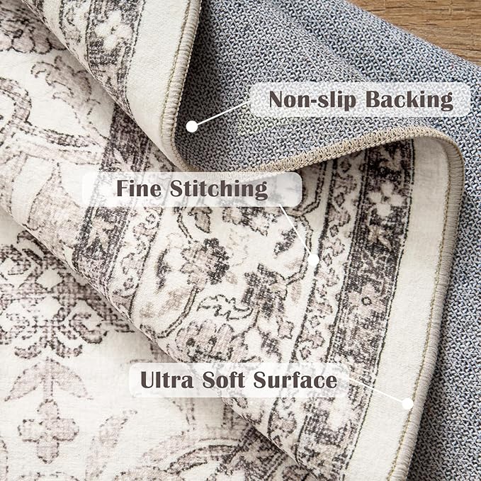 jinchan Round Rug 4ft Washable Circle Soft Rug - Low Pile Vintage 4'Round Indoor Beige Floral Print Stain Resistant Boho Carpet Ultra-Thin Non-Slip for Entryway Nursery Bedroom Dining Room Kitchen