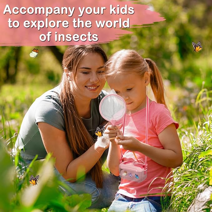 - 2Sets for Your Kids: We will provide you with two sets of outdoor toys for kids ages 4-8, one green and one pink, each set contains an insect box (with an adjustable strap), a scissor-style capsule insect clip, a tweezer, and a butterfly net. A complete set of outdoor exploration kits specially designed for boys and girls aged 3-8 can allow your children to get close to nature, get to know and observe animals, and gain more knowledge.
