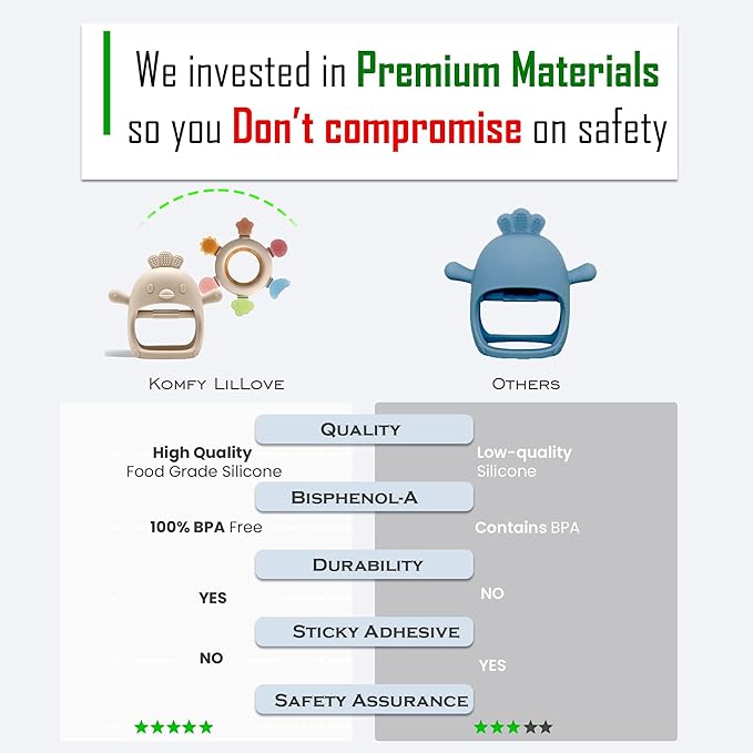 - Soothing Teething Relief for Little Hands: Komfy LilLove silicone chick-shaped hand teether and silicone ring teether for babies are made to fit securely on small hands, making them perfect for little ones who can’t hold regular teethers yet. The built-in grip bar of our baby teething toy helps them grasp better, while the soft silicone texture protects tiny fingers. The playful character arms mimic a nipple to calm fussy babies.