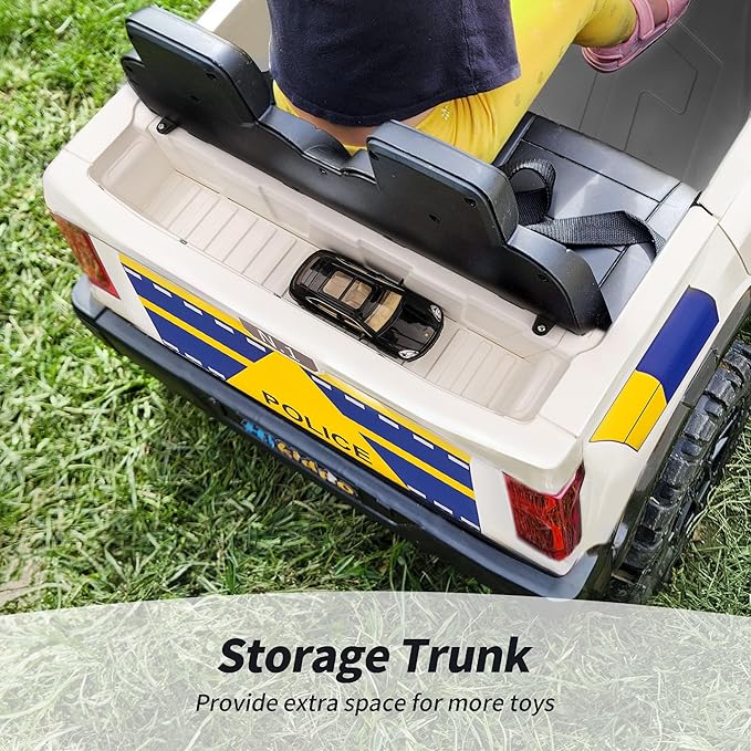 - 19" DUAL SEATER : This battery powered police kids car has ample seater, allowing two children to ride together comfortably under 110lbs. Adjustable seat belts and double-locking door design also ensure kid's safety.