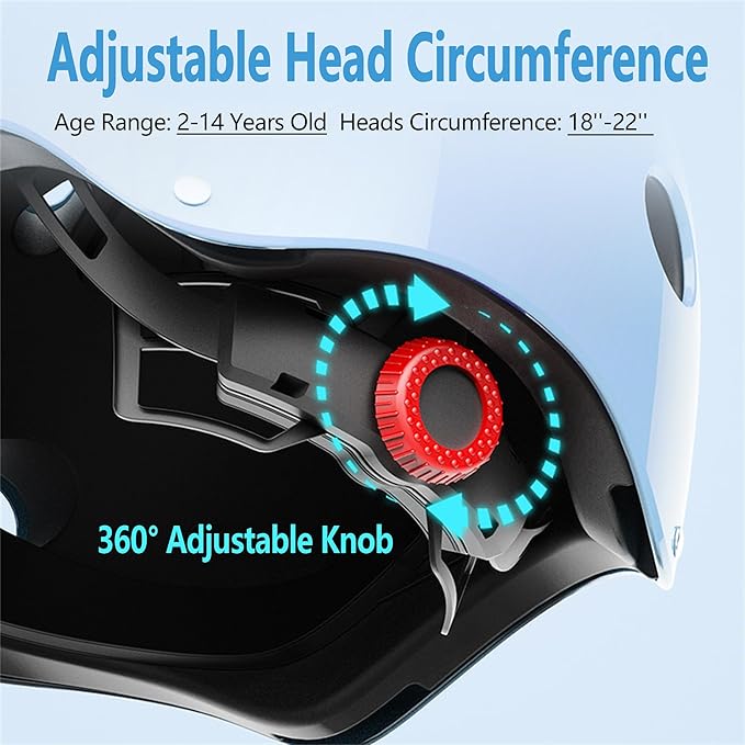 - 🏂️【LIGHTWEIGHT ADJUSTABLE HELMT】Kids bike helmet only weighs 280g, Children helmets have adjustable crank adjustment dial and strap ,and changing the length of the chin strap, maximize the best fit and comfortable wearing, perfectly for boys and girls 2-3-5-8-14 years old. Toddler helmet size: 18'-22',one kids helmet set can be used for a few years.