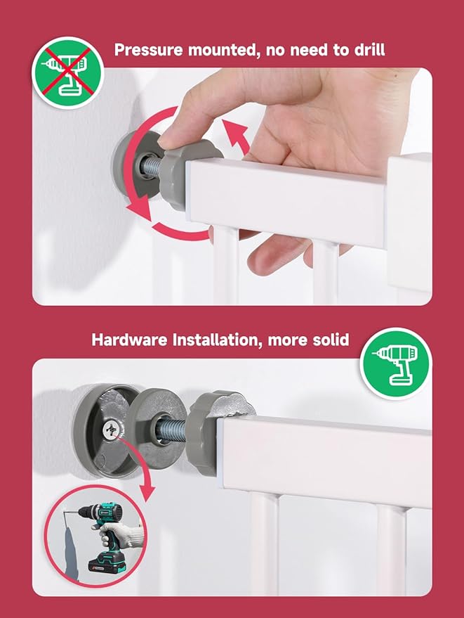 - Easy to Install and Wall Friendly: The pressure mounted baby gate is easy to assemble and disassemble. It is sturdy, durable, convenient, and doesn't require drilling or tools, which can protect your walls from damage and keep the wall clean and intact even after the baby door is removed. You can remove it at any time when not in use and it can be reused. (Measure the installation distance of the upper and lower walls. Make sure the door is betwwen 29.5 9-46" wide)