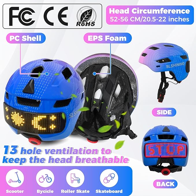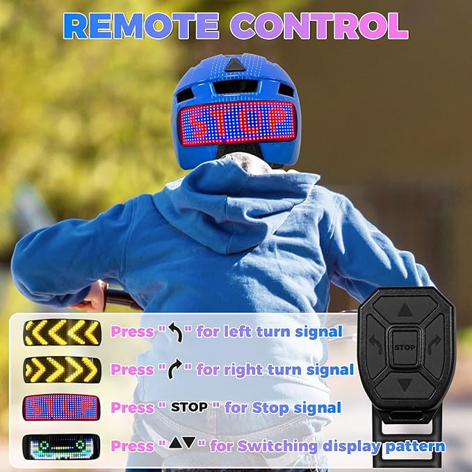 - KIDS HELMET WITH LED LIGHTS: The tail is equipped with an LED display screen with 432 RGB lamp beads, which can be controlled by a remote control and can display a variety of patterns. At night or in low light conditions, it significantly improves the visibility of the riding vehicle and increases safety