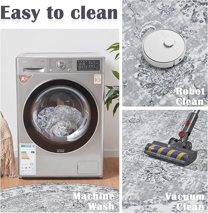 jinchan Round Rug 7ft Area Rug - Grey Vintage Floor Mat Kitchen Indoor Ultra-Thin Soft Floral Print - Washable Circle 7' Retro Accent for Farmhouse Non Slip Dining Room Living Room Bedroom Office