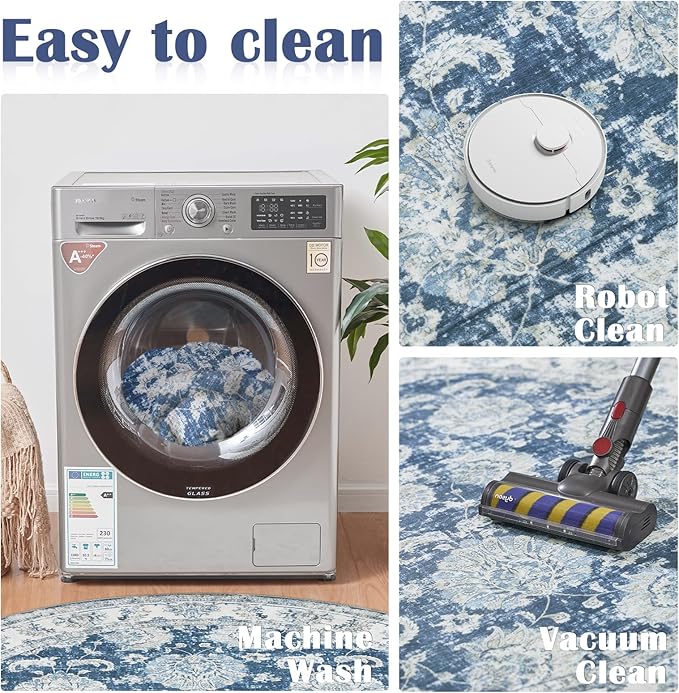 jinchan Round Rug 4ft Area Rug - Indoor Vintage Hallway Circle 4' Washable - Ultra-Thin Low Pile Soft Small Non Slip Distressed Floral Print for Living Room Dining Room Bedroom Entryway Dark Blue
