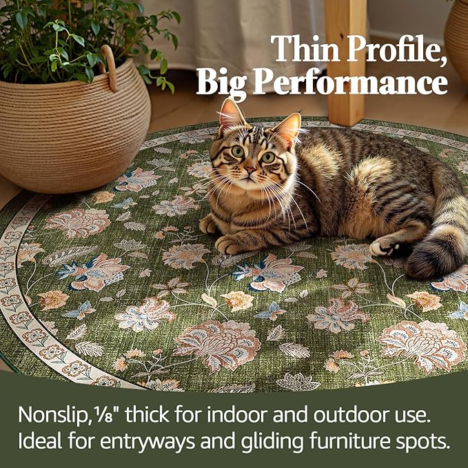 jinchan 8ft Floral Round Rug for Dining Room Washable Living Room Rug Vintage Romance Design Non Slip Indoor Floor Cover Lightweight Low-Profile Throw Carpet for Bedroom Porch Patio, Green