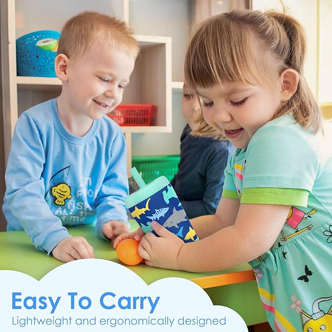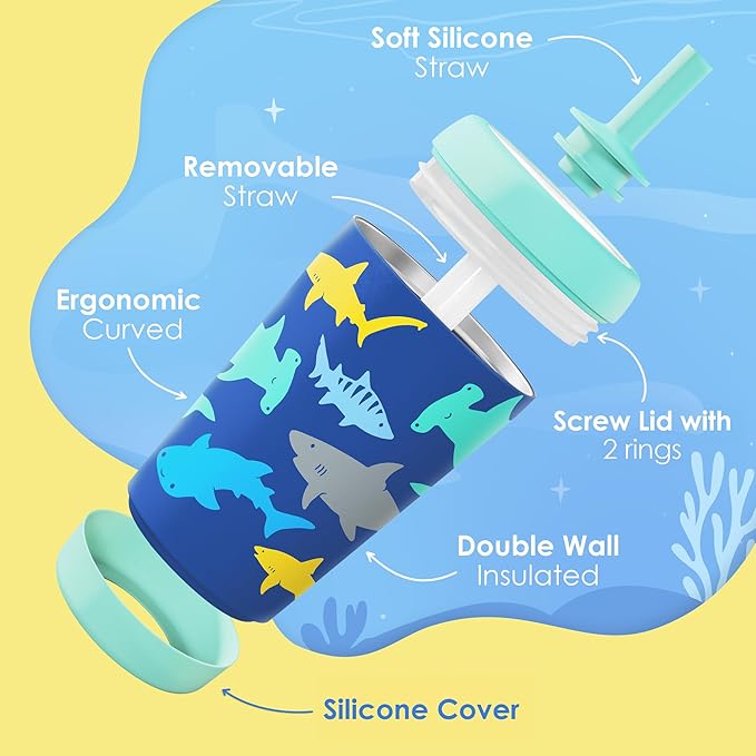 Kid Insulated Stainless Steel Tumbler with Silicone Straw, 12oz Sippy Cup for Kids (Sharks)