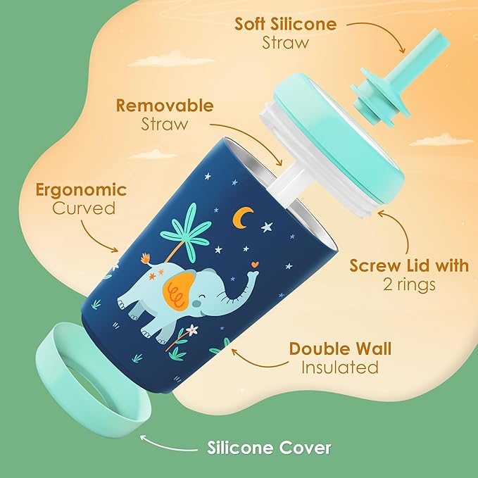 Kid Insulated Stainless Steel Tumbler with Silicone Straw, 12oz Sippy Cup for Kids (Dreamy Elephant)