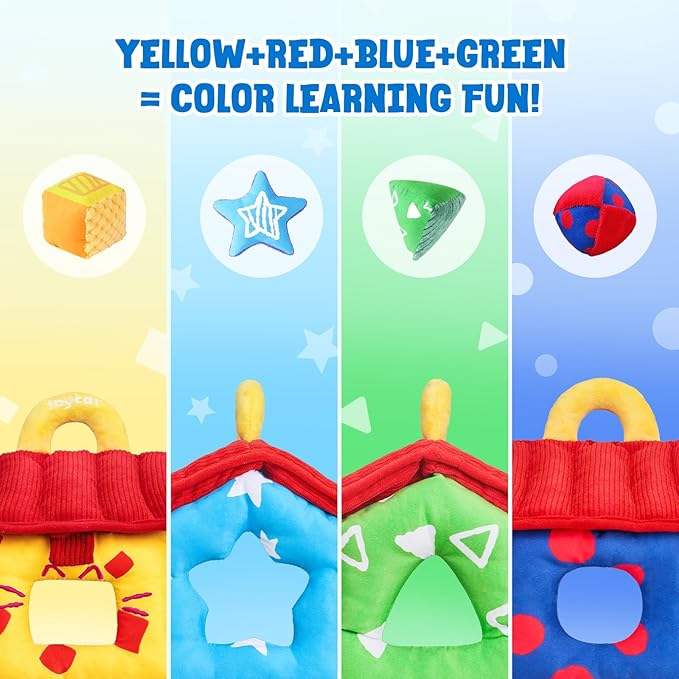 - All-in-1 Sensory Sorter: This soft fabric house includes 4 plush shapes, each with unique textures, sounds, and crinkles to stimulate touch, hearing, and curiosity. The Hide-and-seek roof hides a baby-safe mirror for self-discovery!