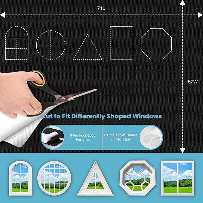 - 【DIY Shape】: Our temporary blackout shades are highly versatile and can be customized to fit any indoor window shape or size, including common types such as bay windows, skylights, door windows and so on. Remember to cut it a little larger than the window for better blackout effect.