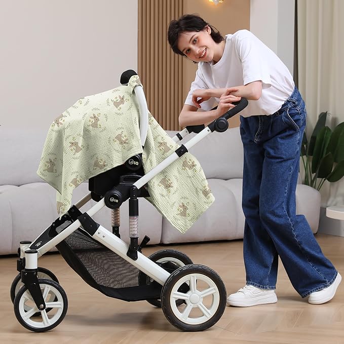 100% Muslin Cotton Car Seat Cover Baby, Carseat Canopy Cover, Universal Fit Stroller Covers for Boys and Girls (Cute Rabbit)
