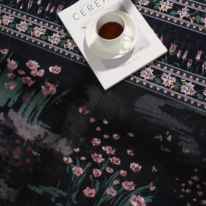 3x5 Washable Rug Impressionist-Style Vintage Non Slip Low Pile Small Carpet for Bedroom Bedside Kitchen Entryway Kids Room Office College Dorm Essentials for Girls, Black