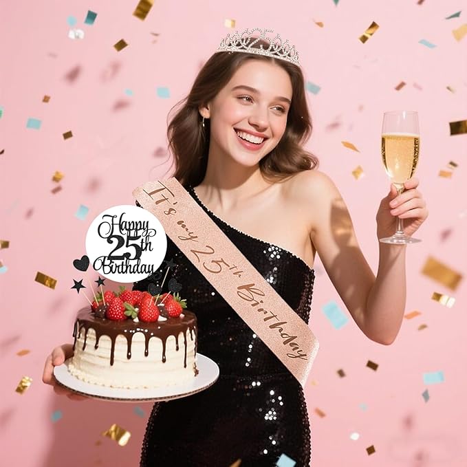 - 25th Rhinestone Crown & Sparkly Sash: The birthday sash, made of soft fabric via hot-press stamping glitter technique, features superior quality with non-shedding glitter and rose gold it's my 25 birthday letters. The crown, crafted from sturdy hard alloy with dazzling rhinestones, is meticulously designed for 25th birthday parties.