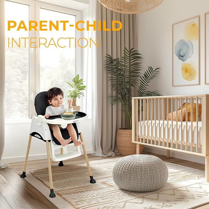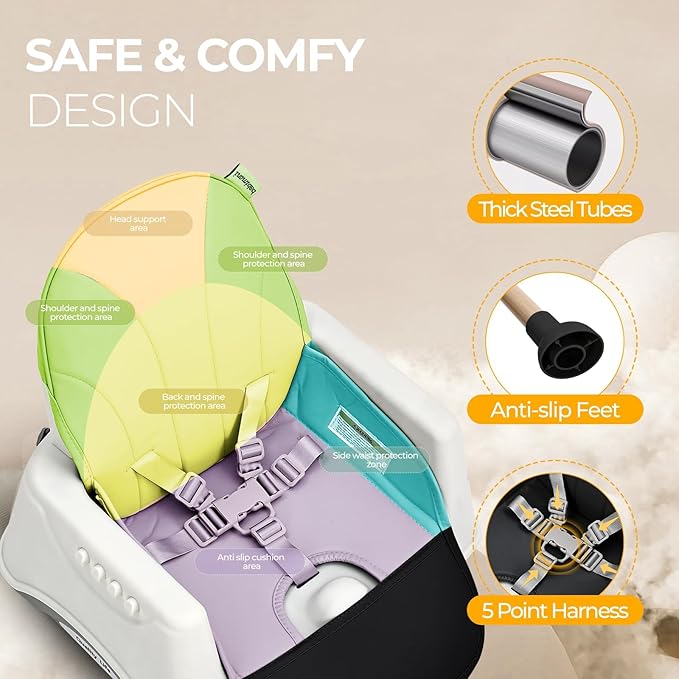- Multiple Safety Protections: Sturdy steel tubes and a golden triangle design prevent tipping. The adjustable 5 point harness high chair ensures your baby’s safety, making this highchair a top choice for parents.
